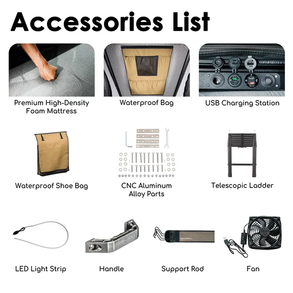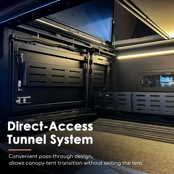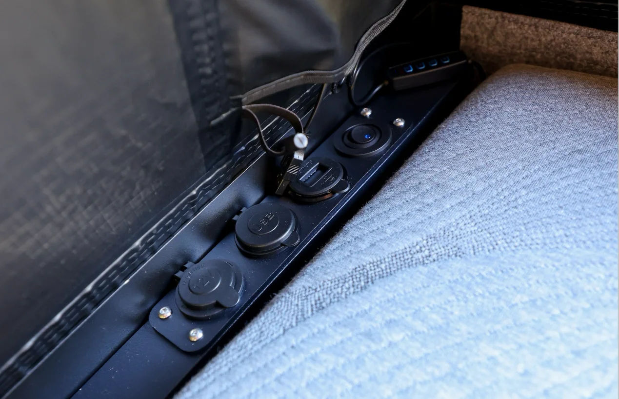 Our camper canopy comes equipped with a cutting-edge electrical system, designed for both convenience and comfort. Standard features include switch-controlled exterior camping lights, ceiling-mounted LED strip lights in the tent with color and dimming control, integrated canopy strip lights, dual USB and Type-C chargers, a cigarette socket, and a voltage gauge. This system ensures you stay powered and illuminated — enhancing every outdoor adventure.